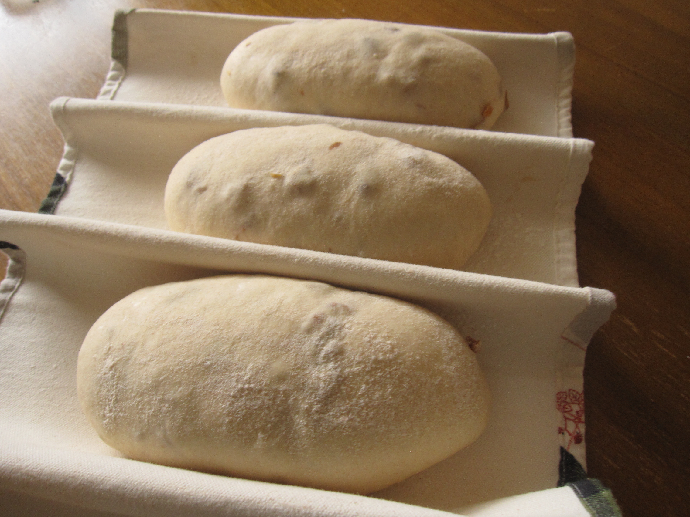 | 3分割して棒状に成形して布どりのなかで2次発酵。出張の片づけをして、明日のグループレッスンの計量(13組分)、それから。近所のスモークなおさんにベーコン60枚をオーダーして取りに行きました。「富がえりのレシピ」を店内閲覧用に1冊お買上げいただき、おしゃべりして帰宅すると、順調に膨らんできました。